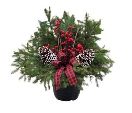 Holiday 12" tall square pot stands approx. 25" tall and includes a variety of fresh greens, branches, a bow and holiday picks.